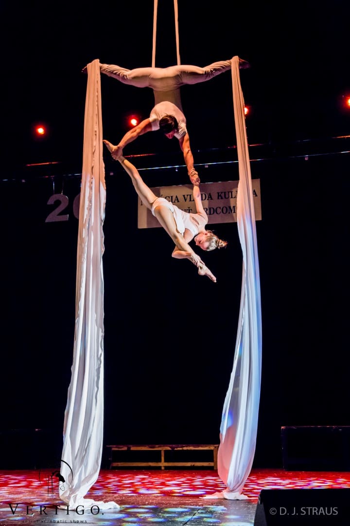 We have a highly skilled aerial silk performer who mesmerizes audiences with stunning acrobatics on long fabric ribbons, known as silks, suspended from above. With incredible strength, flexibility, and artistry, the performer climbs, wraps, and maneuvers through the silks, showcasing breathtaking poses, dynamic drops, and fluid movements. This captivating act is perfect for live events, and stage shows, delivering an unforgettable blend of athleticism and elegance. The performance can also be executed by duo aerialists, offering synchronized and dramatic displays. Customization options include a variety of costumes and silk colors to match your event’s theme or aesthetic.