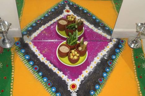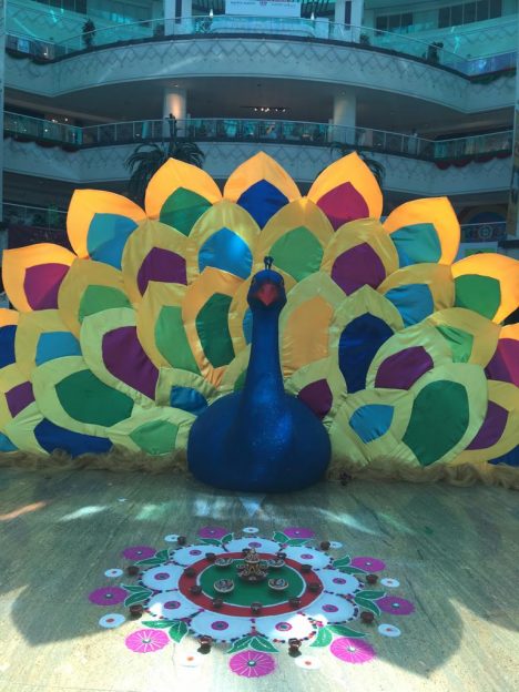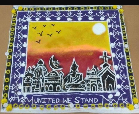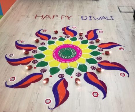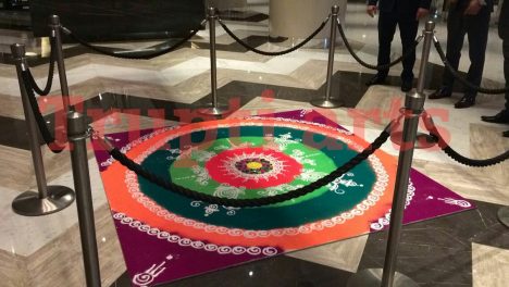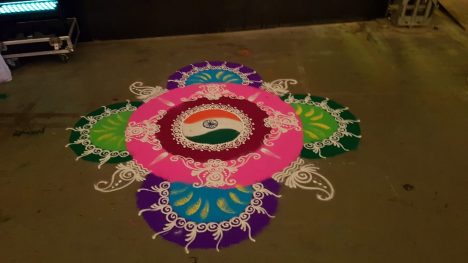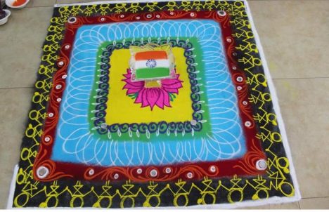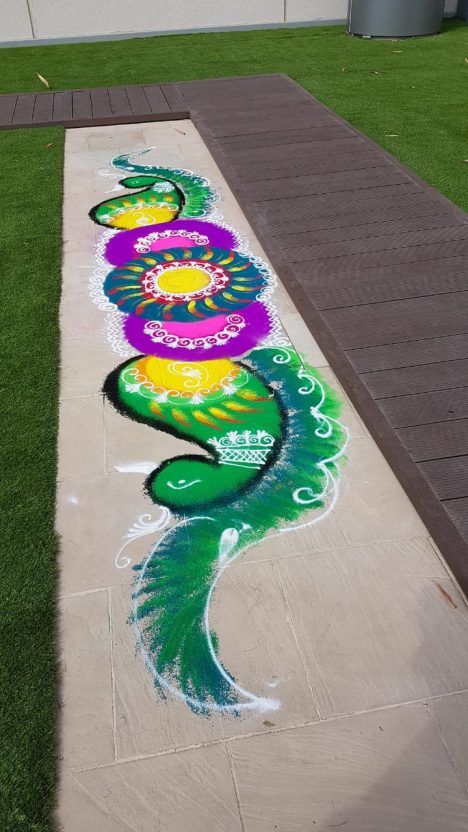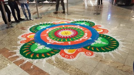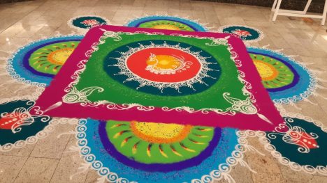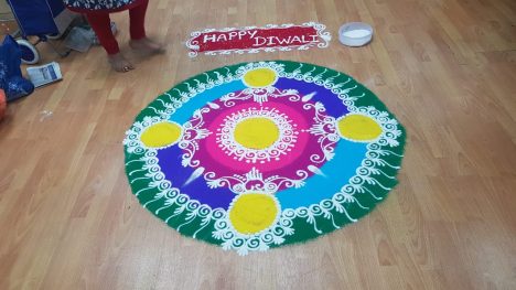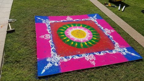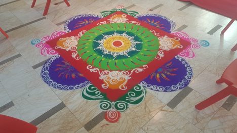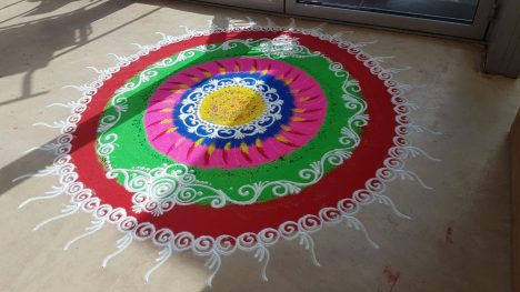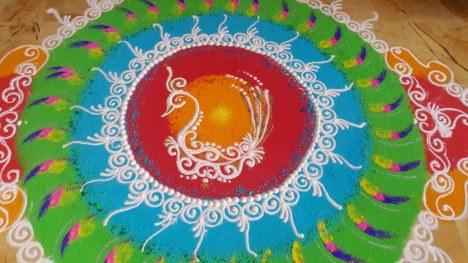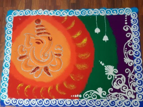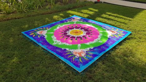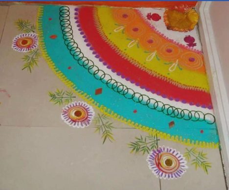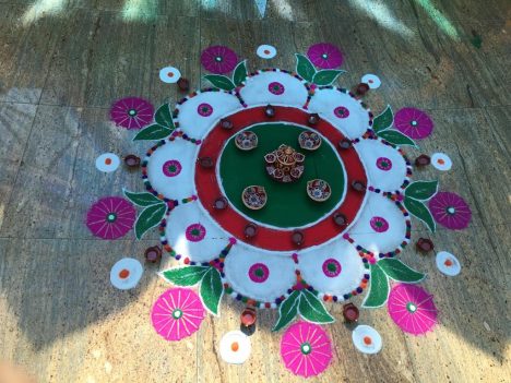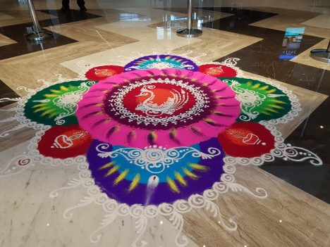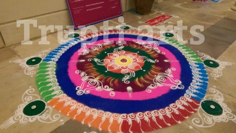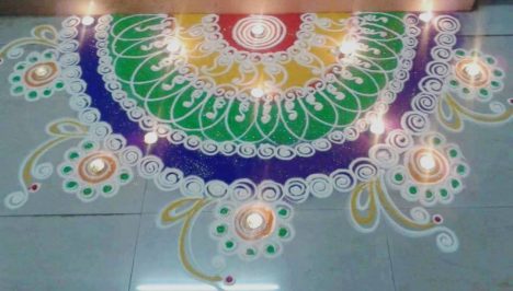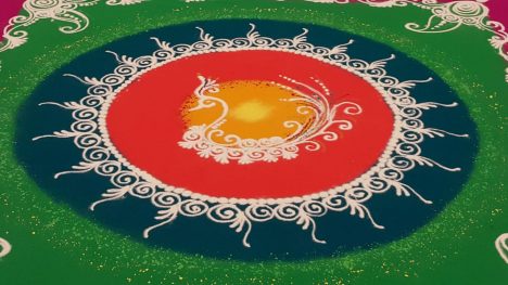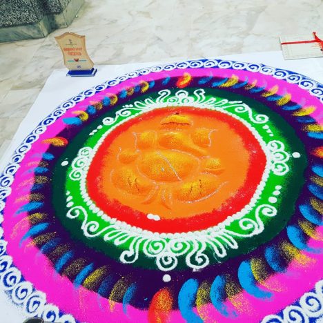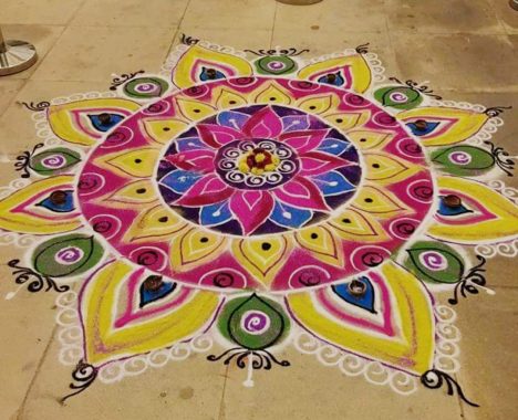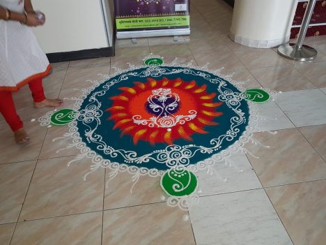 Rangoli is a created on the courtyards or living room floors for the traditional art form native to Nepal, India, and Bangladesh (known as Alpana) in which patterns made with materials coloured rice or sand, dry flour, or and petals.