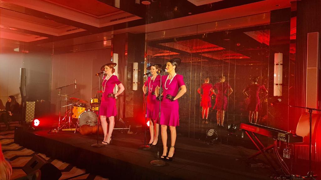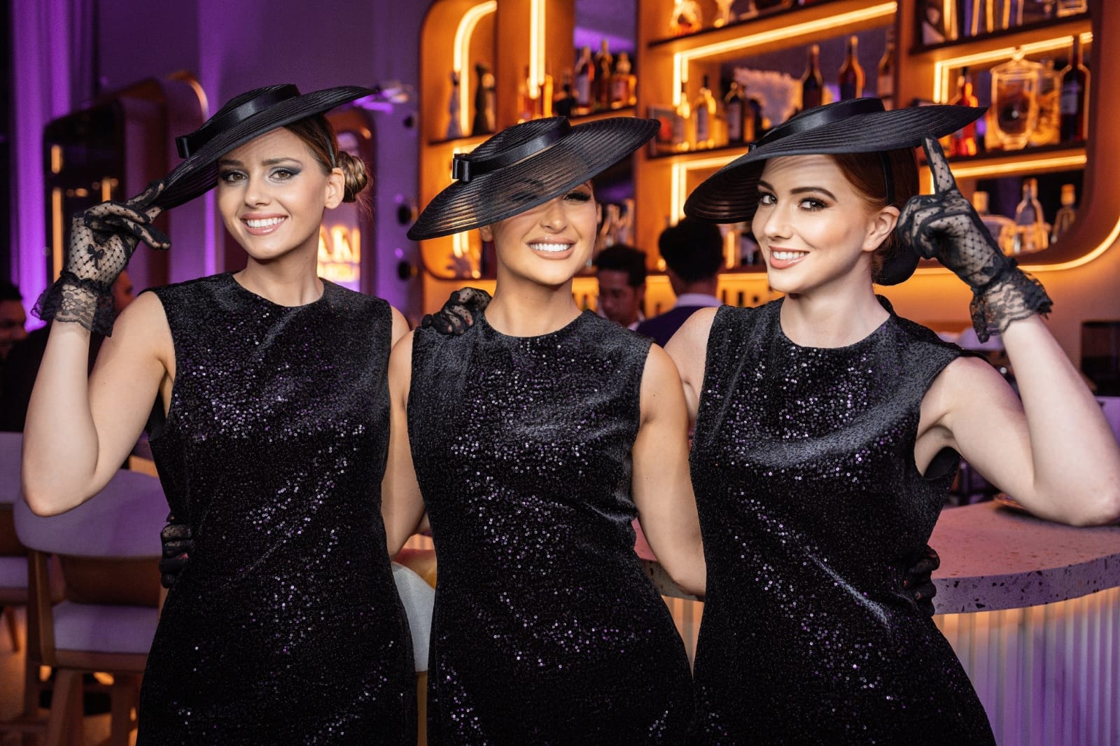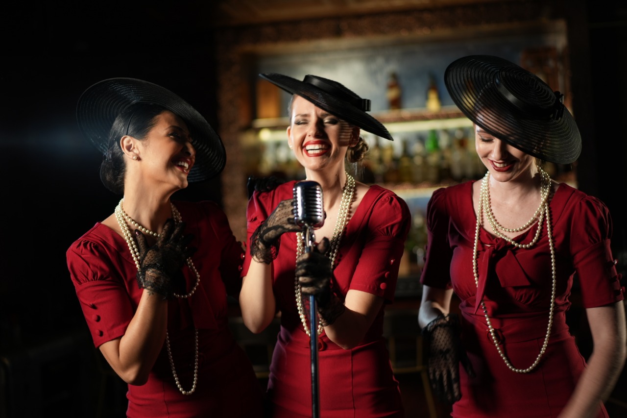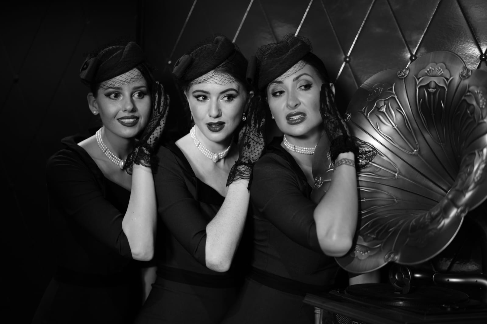 A stylish three-piece ladies jazz band with a flair for elegance and harmony. The singers are dressed in coordinated, vintage-inspired outfits. Their look is reminiscent of the golden jazz era, exuding sophistication and a timeless charm. They perform with poise, blending their voices in smooth, sultry harmonies, effortlessly covering jazz standards, swing, and soulful ballads. Their presence adds a touch of class to any venue, transporting audiences to the smoky, intimate jazz clubs of a bygone era.